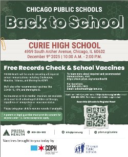 Curie will be hosting a Rcords Check and Vaccine Clinic for CPS students on Tuesday, December 9th. Parents can register the students using the QR Code in the Flyer or at https://register.prism.org/?eventId=a7495fae